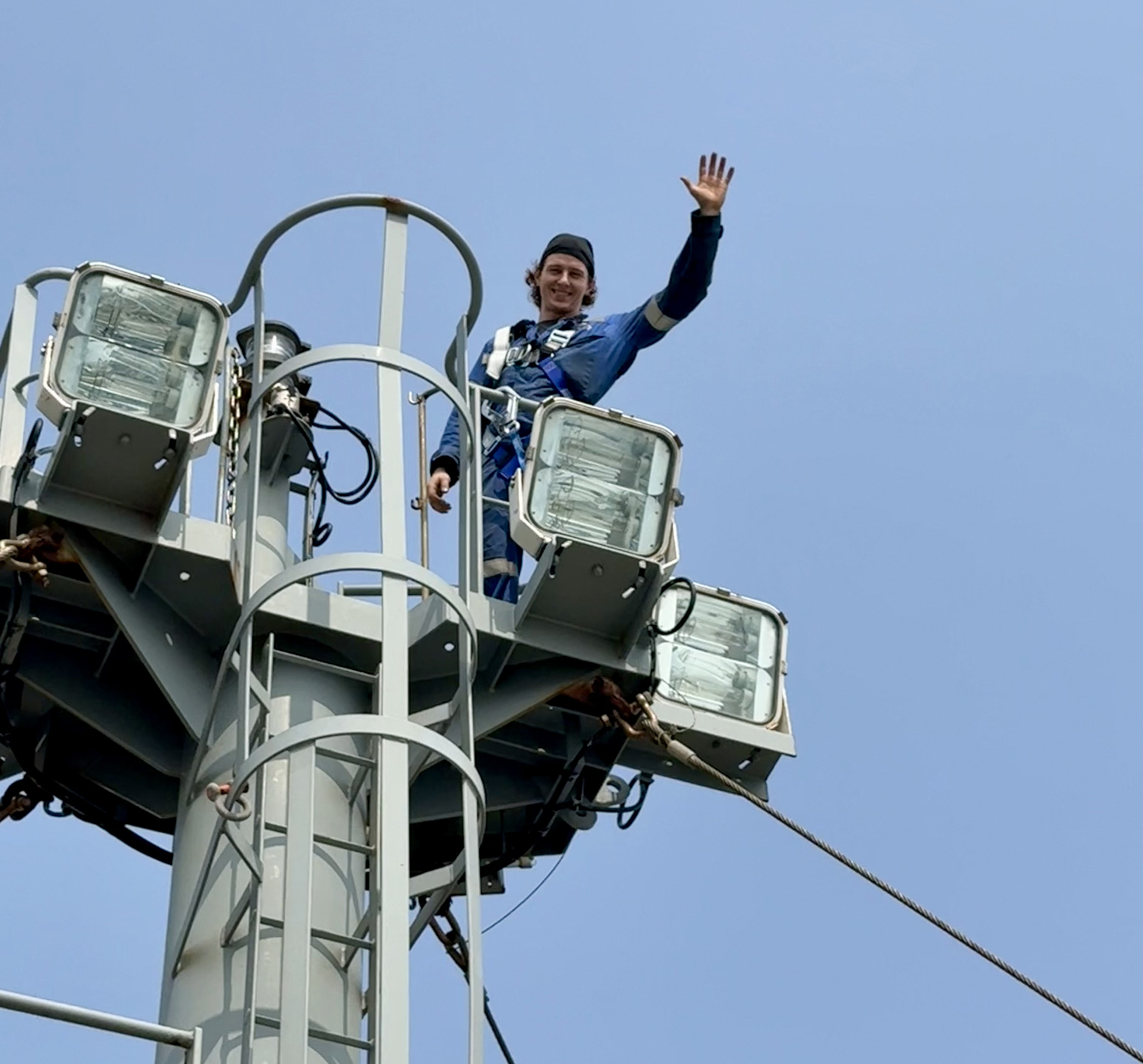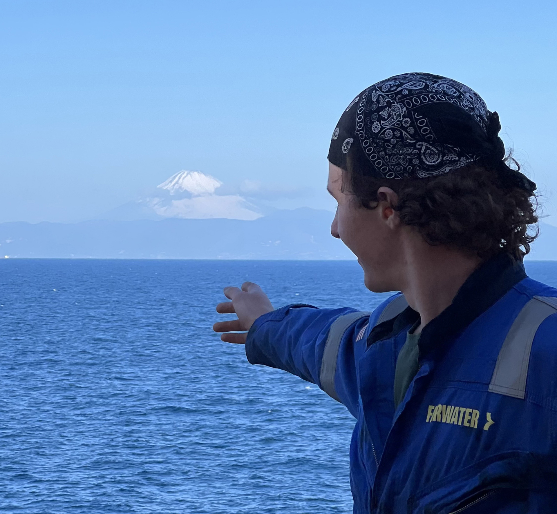 AMO member Third Assistant Engineer Nicholas Tereshko takes in a view of Mt. Fuji en route to Yokosuka, Japan, and works on the navigation light while docked in Sasebo onboard the Torm Timothy.
