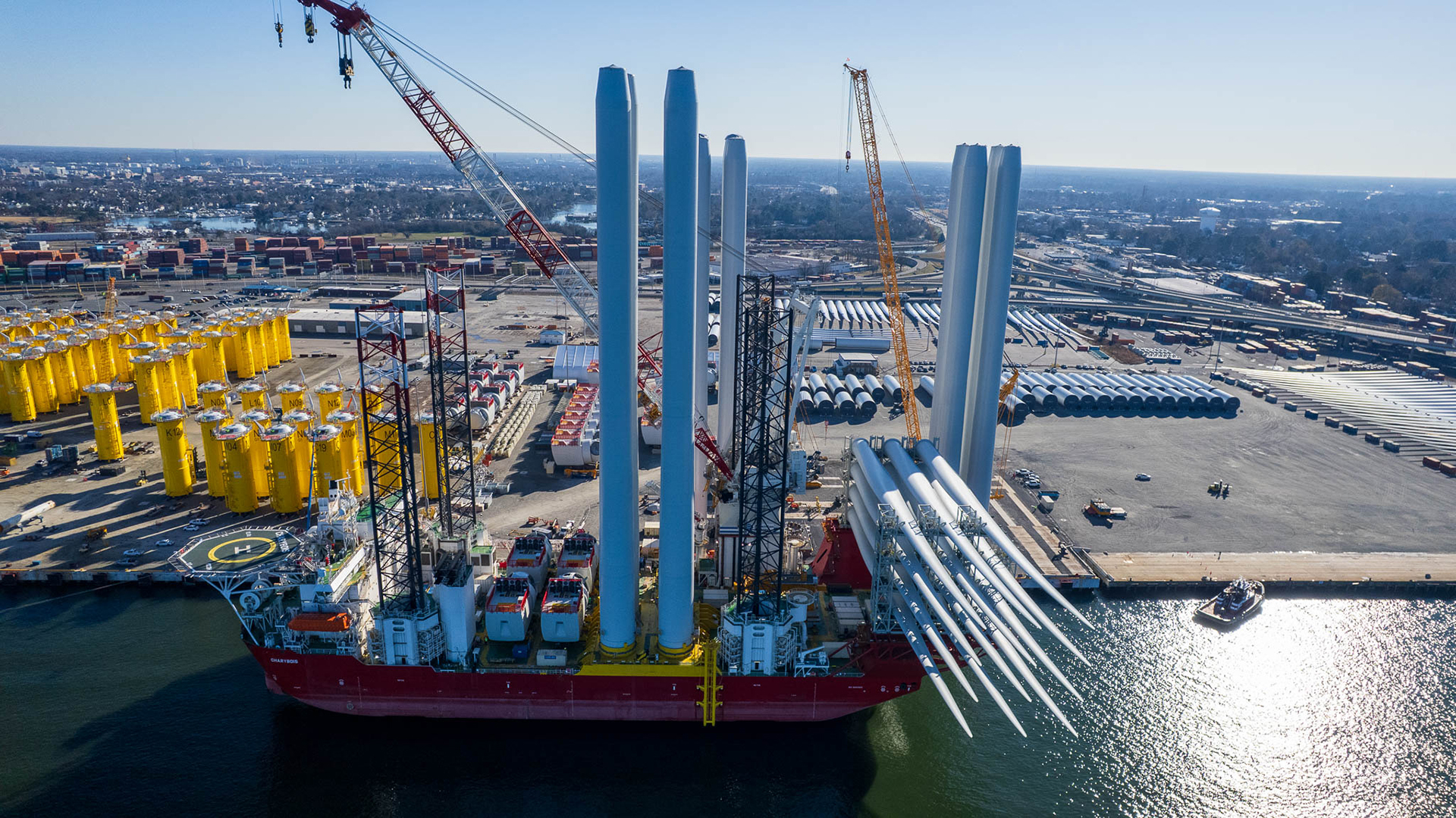 The Charybdis is a self-elevating vessel equipped with a DP-2 dynamic positioning system. She is outfitted to carry four 14.7 MW wind turbine generators from her homeport of Portsmouth, Va. to the CVOW field and install them using her 2,200-metric-ton SWL main crane. Charybdis will continue installation of the balance of the 175 remaining turbines in the CVOW field 27 nautical miles off the coast of Virginia Beach. When completed, CVOW will provide 2.6 gigawatts of power, enough for 660,000 homes.
