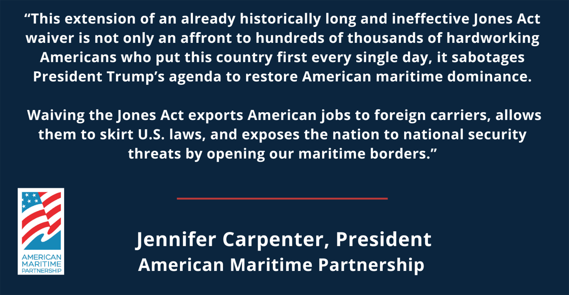 “This extension of an already historically long and ineffective Jones Act waiver is not only an affront to hundreds of thousands of hardworking Americans who put this country first every single day, it sabotages President Trump’s agenda to restore American maritime dominance,” said Jennifer Carpenter, President of the American Maritime Partnership. “Waiving the Jones Act exports American jobs to foreign carriers, allows them to skirt U.S. laws, and exposes the nation to national security threats by opening our maritime borders.”